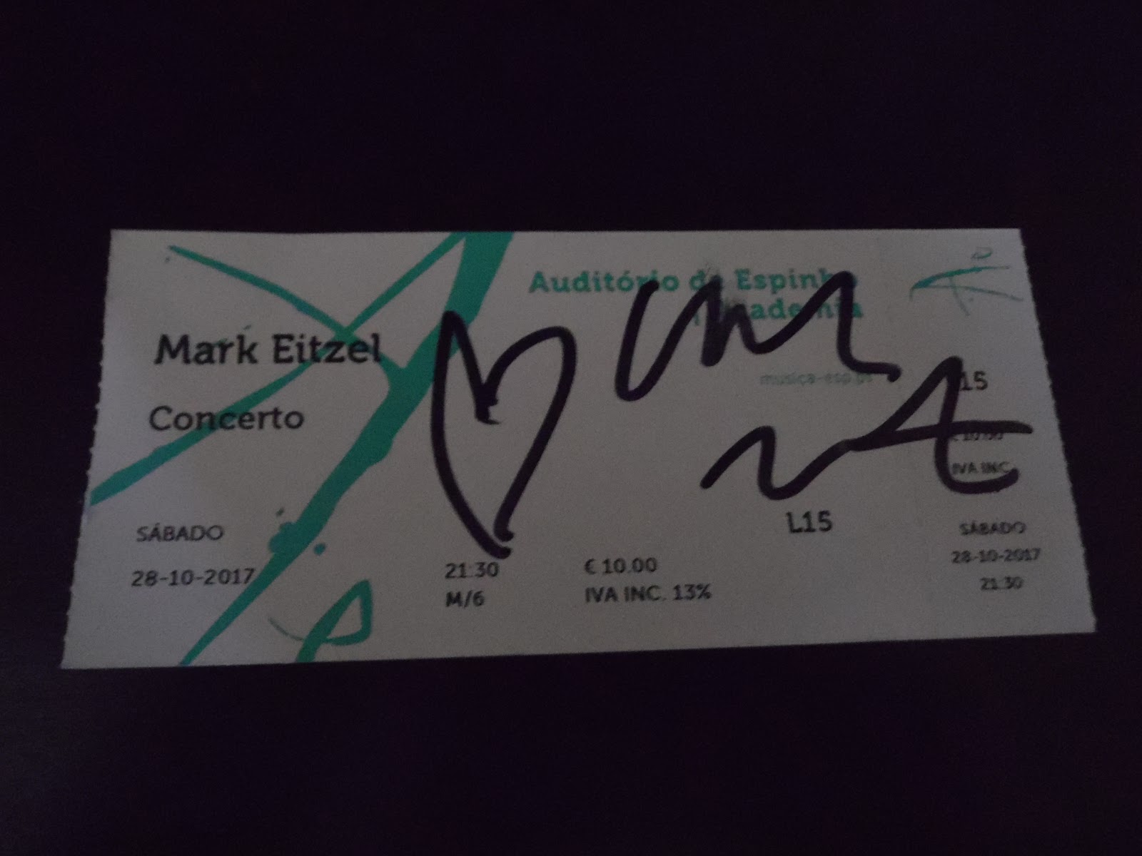 era bem evidente o ar de satisfação do público quando se começou a juntar à saída do auditório, à espera dos músicos. mark eitzel, ainda com o copo de vinho tinto na mão, surgiu com a sua banda. interpelei-o quando passou por mim, soltando um "fantastic show!", ao que ele respondeu, sorrindo, "cheers, thanks man!". depois, foi esperar pela minha vez, para ele me assinar o bilhete do concerto. enquanto o fazia, atirei o que me veio à cabeça, referindo-lhe que já seguia a sua carreira desde o primeiro disco dos american music club, "restless stranger", de 1985, algo que ele soube reconhecer e valorizar. depois, ainda lhe disse, enquanto lhe apertava a mão, que ele estava melhor de disco para disco, recebendo um enorme sorriso e um sentido "my god, thank you very much!".